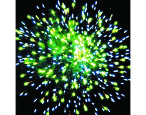 5. Свистящая комета (змейка) разрывается красно-белой мерцающей сферой (пион) и облаком трещащих разрывов (трещащая хризантема). (30-40 сек., до 40 м)